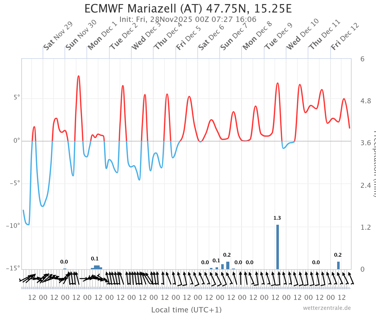 Das Wetter am Wochenende wird überwiegend sonnig und ruhig, bis Montag ist kaum Niederschlag vorhergesagt. Ab Sonntag legt die Temperatur in der Höhe langsam zu und in 2000m werden bereits +2 Grad erreicht. Laut den Prognosemodellen ist bis kommenden Freitag nicht mit nennenswertem Neuschnee in der Steiermark zu rechnen und das Temperaturniveau steigt langsam an.